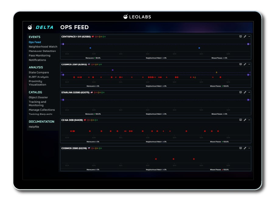 Delta は、 LeoLabs の垂直統合された分散型レーダーネットワークと、世界をリードする商用低軌道物体カタログを活用することにより、運用に不可欠なインテリジェンス収集・リアルタイムの脅威監視・軌道上アセットの防護を実現します。各ミッションの関心物体に対し、絶え間ない監視・異常の検知と特徴づけ・軌道上活動パターンの解析を行い、運用判断へと直結するようなアラートや知見へと自動的に変換・統合した上で、直接運用者へ配信いたします。