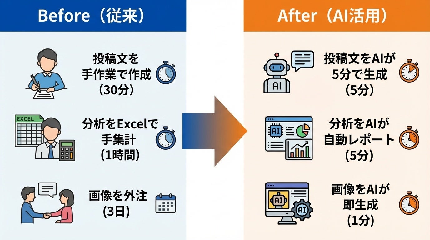 研修中に実際の自社アカウントの投稿をAIで作成します。従来30分かかっていた投稿作成が5分で完了する体験をその場で実感できます。