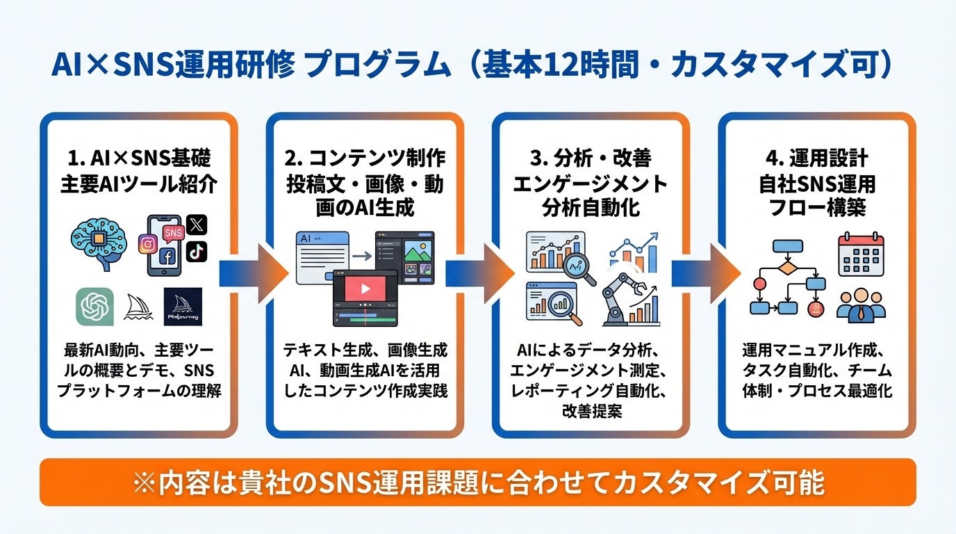 X(旧Twitter)・Instagram・LinkedIn・note・Facebookなど主要プラットフォームに対応し、投稿文の自動生成、AI画像・動画制作、エンゲージメント分析の自動化まで、SNS運用の全工程をAIで効率化する手法を体系的に指導いたします。