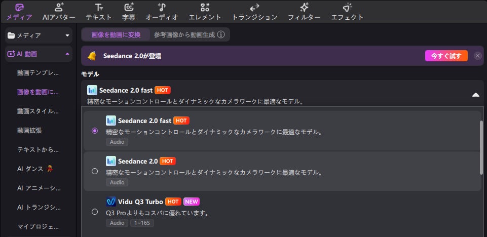 特にスピードを重視する場合は、「Seedance 2.0 Fast」の利用がおすすめです。