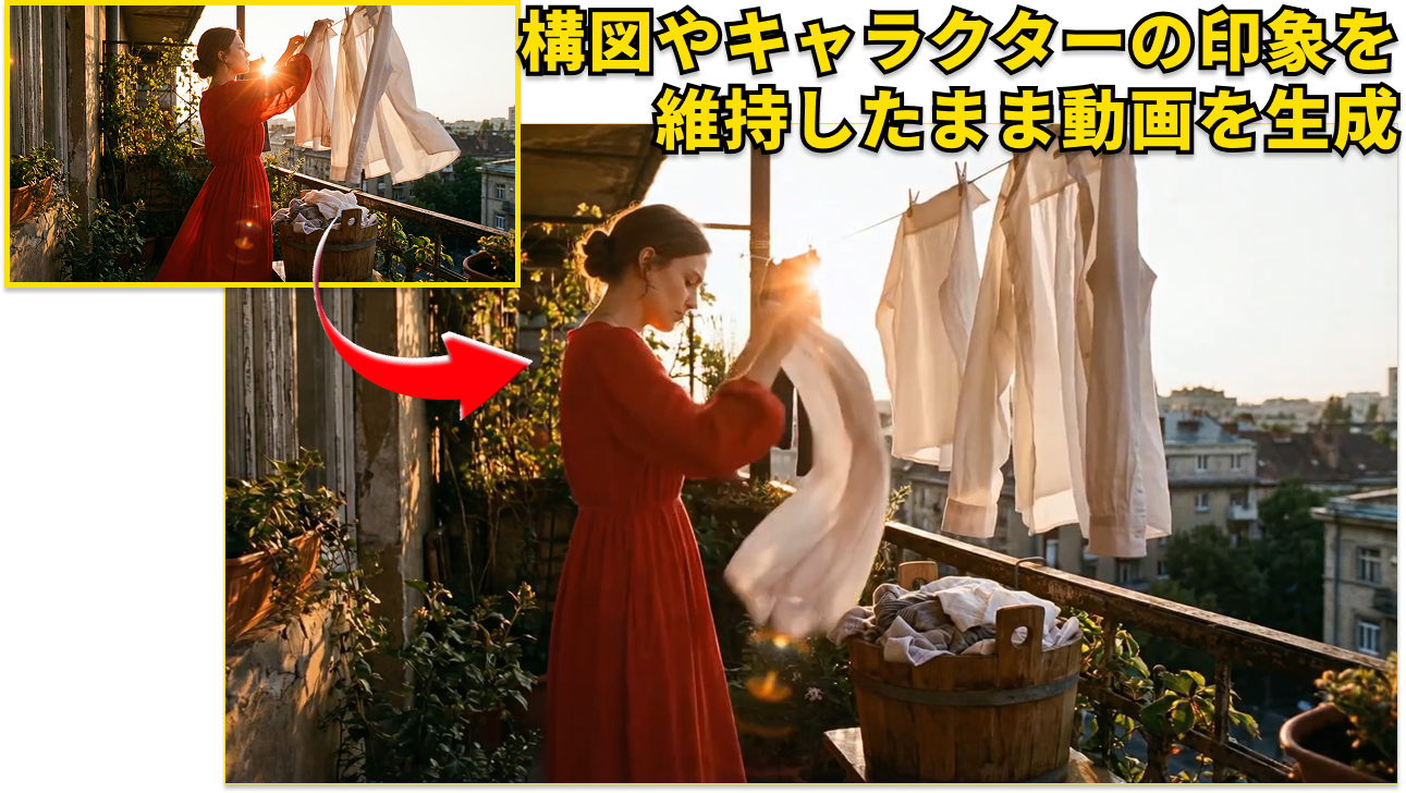 参考画像やテキストを組み合わせることで、構図やキャラクターの印象を維持したまま動画を生成することが可能です。