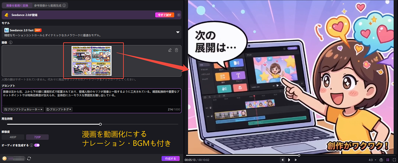 例えば、イラストや漫画からアニメーション動画を生成したり、シンプルなテキストからストーリー性のある映像を構成することが可能です。明確な指示がない場合でも、シーンの流れを踏まえた自然な展開が生成されます。