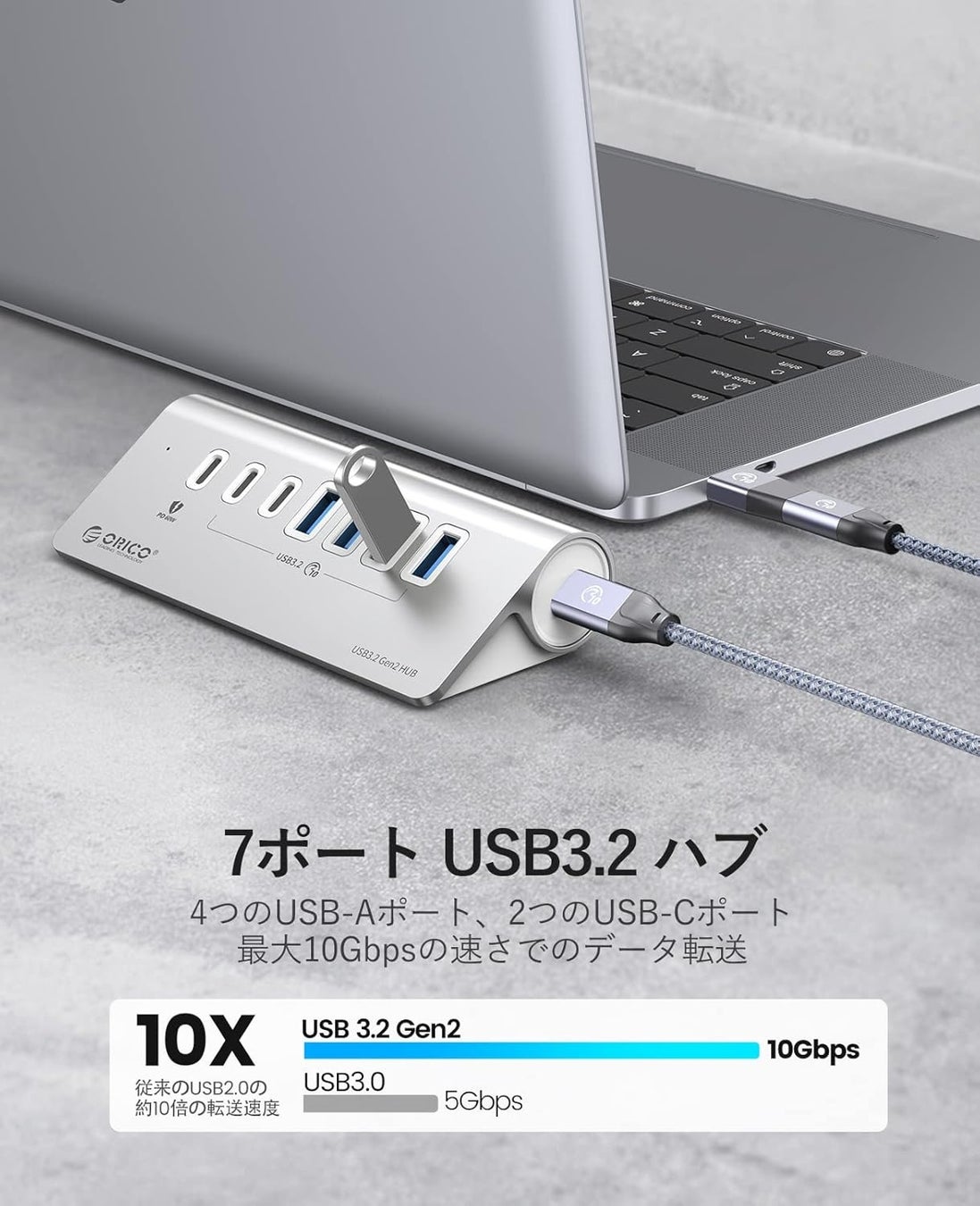 一般的なUSB 3.0(5Gbps)の2倍の速さ、10Gbpsに対応。 大容量の動画データや写真バックアップも、待ち時間を大幅に短縮できます。7ポートすべてがこの高速転送に対応しているのが、ORICOならではの贅沢仕様です。