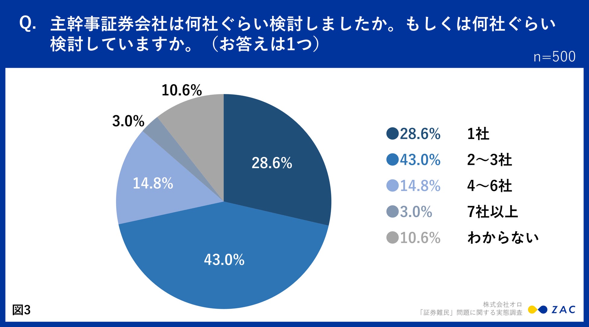 主幹事証券会社の検討社数について尋ねたところ、「2~3社」が43.0%と最も多く、続いて「1社」が28.6%という回答になっています。(図3)