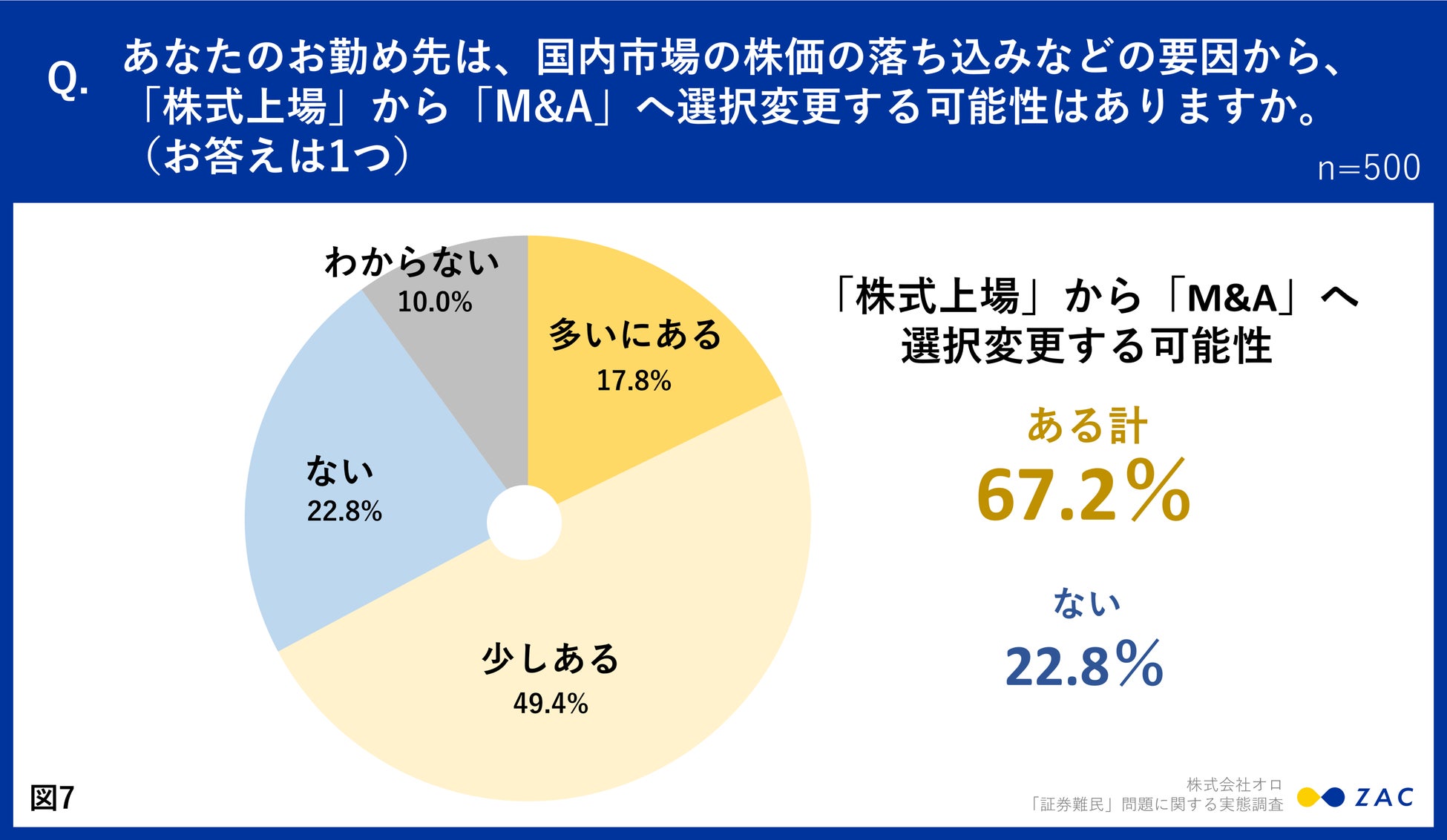 国内市場の株価の落ち込みなどの要因から、今後、「株式上場」から「M&A」へ選択変更する可能性があるかどうかを質問したところ、「多いにある」「少しある」が67.2%。「ない」22.8%という結果になっています。(図7)