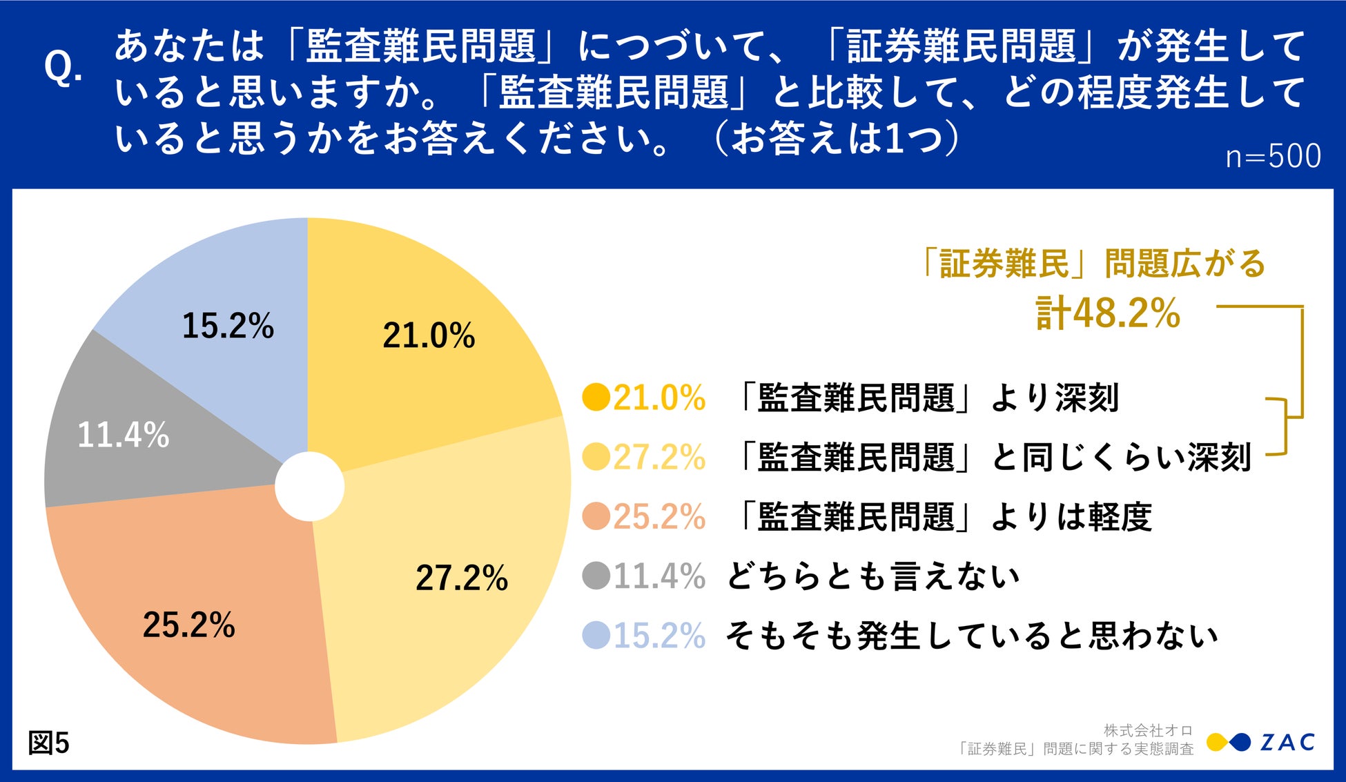 「監査難民問題」につづいて、「証券難民問題」が発生していると思うかを質問したところ、「監査難民問題より深刻」21.0%、「監査難民問題と同じくらい深刻」27.2%という回答になっており、「証券難民」問題が深刻なレベルで発生していると捉えている人の割合が48.2%という結果になっています。(図5)