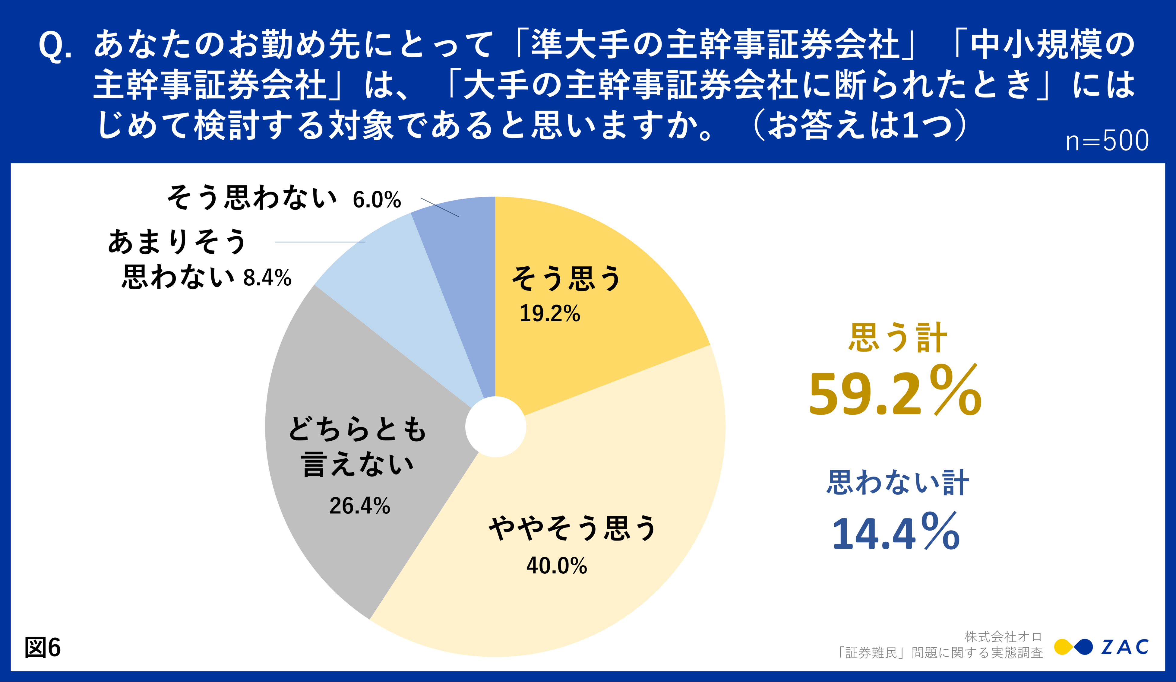 お勤め先の企業にとって「準大手の主幹事証券会社」「中小規模の主幹事証券会社」は、「大手の主幹事証券会社」に断られたときにはじめて検討する対象であるかどうかを尋ねたところ、「そう思う」「ややそう思う」が59.2%という回答になりました。「大手の主幹事証券会社」の人気の高さが分かる結果となっています。(図6)