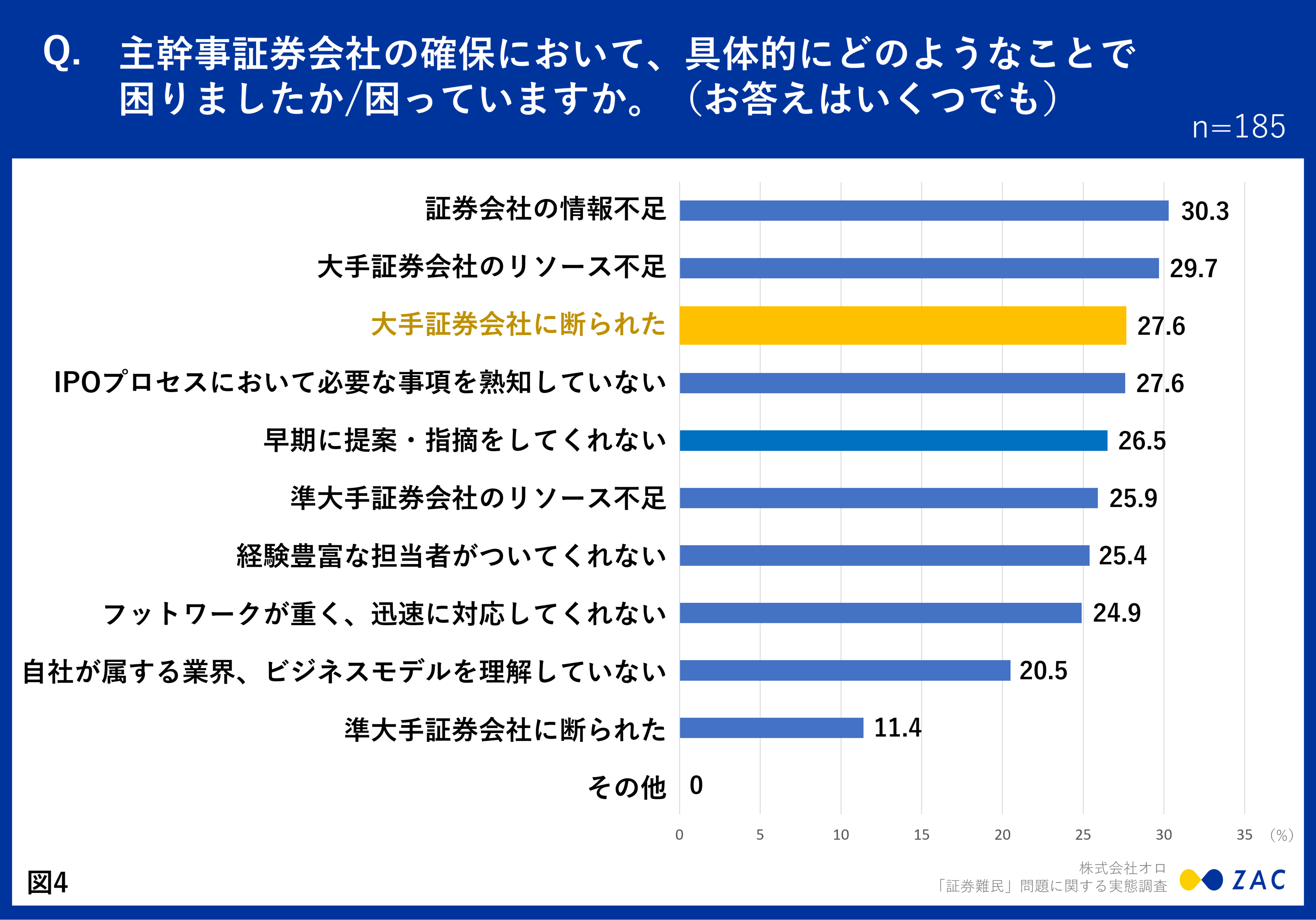 「主幹事証券会社の確保」において、どのようなことで困ったか(困っているか)を質問したところ、「証券会社の情報不足」30.3%、が最も多く、続いて「大手証券会社のリソース不足」29.7%、「大手証券会社に断られた」27.6%という回答になっています。(図4)