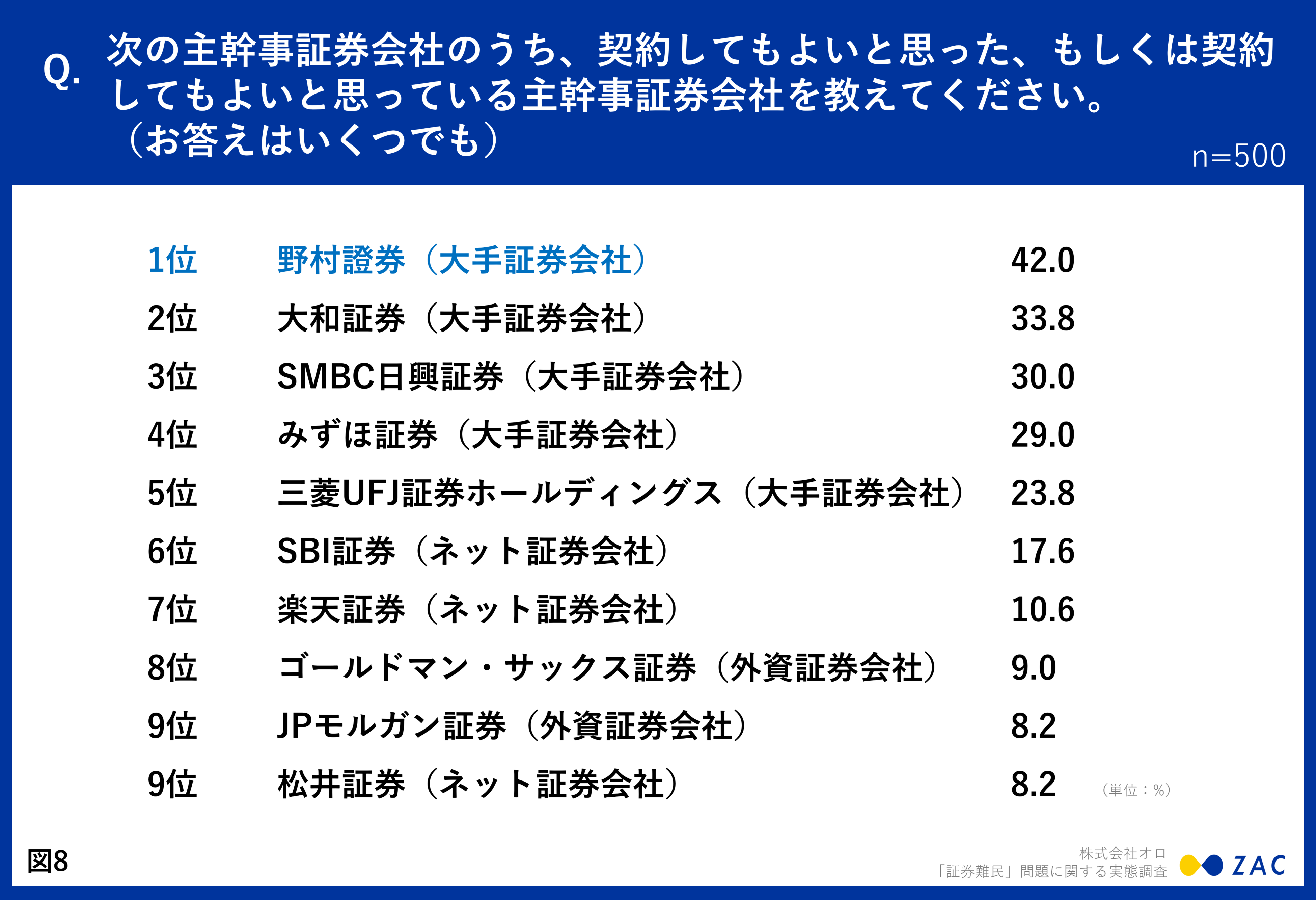 契約したいと思った(思っている)主幹事証券会社を尋ねたところ、1位が「野村證券」2位「大和証券」3位「SMBC日興証券」4位「みずほ証券」5位「三菱UFJ証券ホールディングス」と、大手の主幹事証券会社が上位を独占する結果になっています。一方で、6位「SBI証券」7位「楽天証券」9位「松井証券」と、10位以内にネット証券会社が3社ランクインしました。(図8)