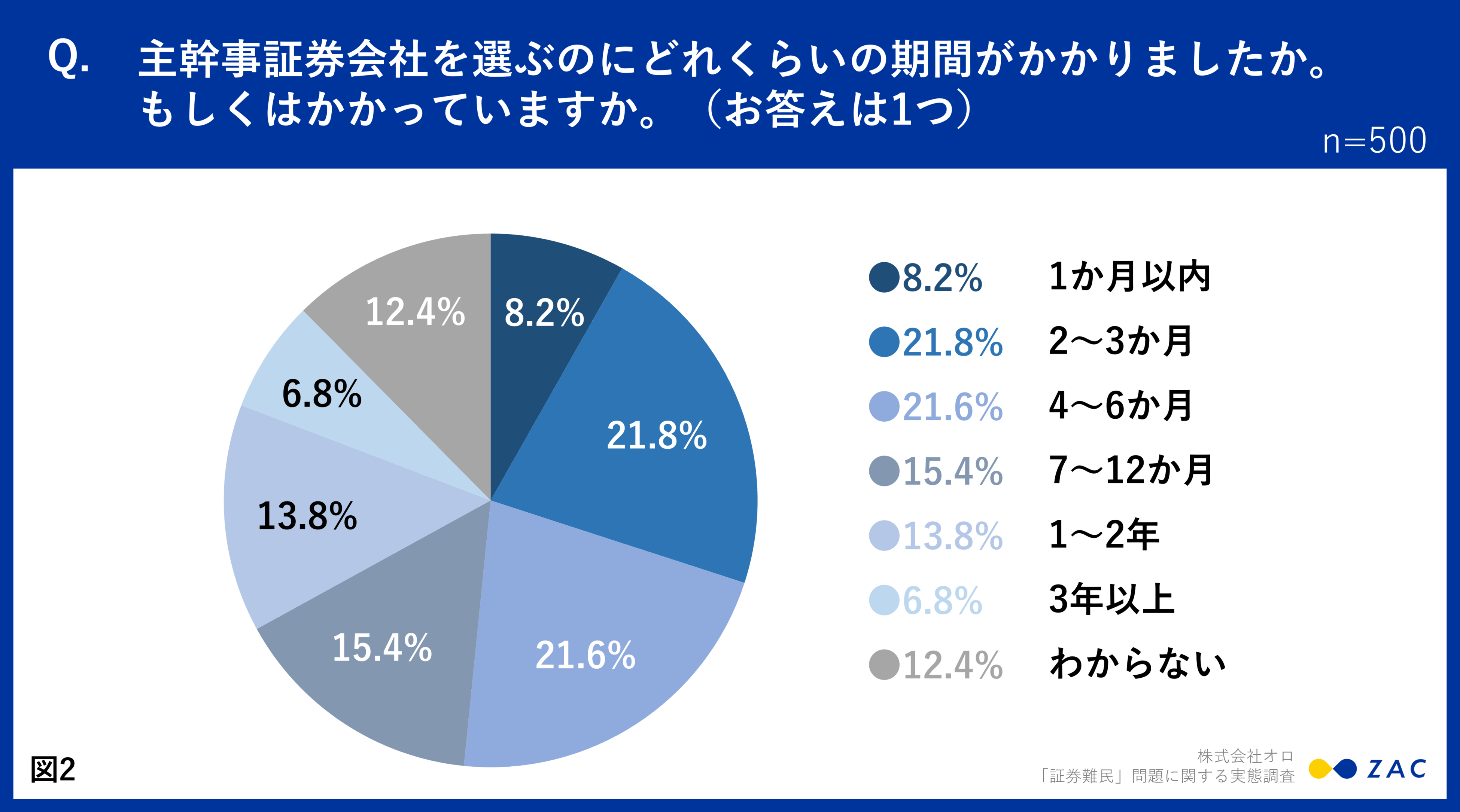 主幹事証券会社の確保にどのくらいの期間がかかったか(かかっているか)を尋ねたところ、「2~3か月」が最も多く、21.8%。続いて「4~6か月」が21.6%という結果になりました。一方で、「3年以上」と長期化するケースも6.8%いることがわかりました。(図2)
