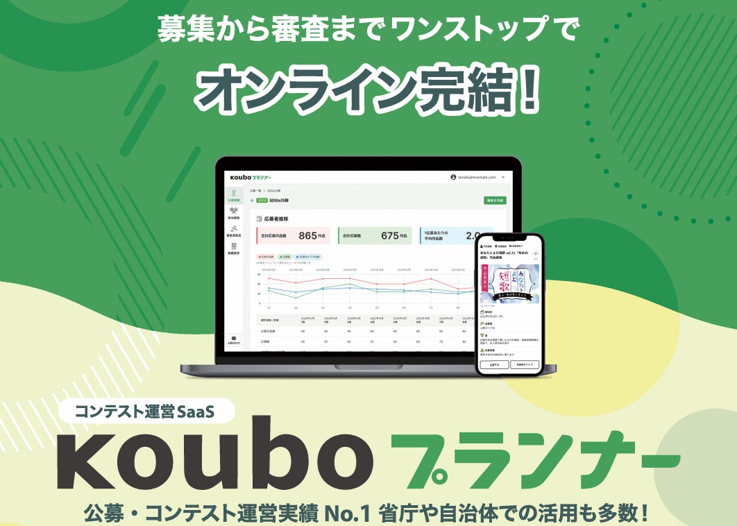 「Kouboプランナー」は、コンテスト・公募の募集告知から応募受付、審査、結果発表までをワンストップで完結できるSaaSプラットフォームです。