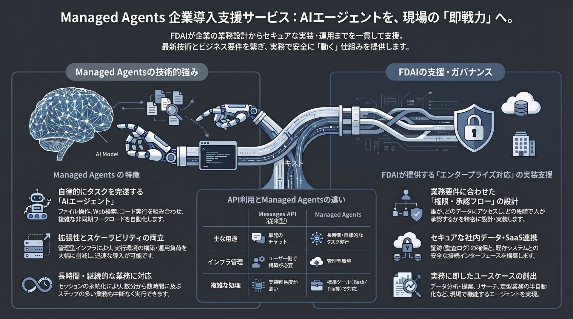 Claude Managed Agentsは、エージェントを動かすための実行基盤を管理型で提供し、長時間実行や非同期処理を扱いやすくします。その一方で、企業ごとの業務ルールに沿った権限設計、監査性の確保、既存システムとの接続などは、個別に設計・実装する必要があります。FDAIは、こうした導入の詰めの部分まで伴走するため、本サービスを開始しました。