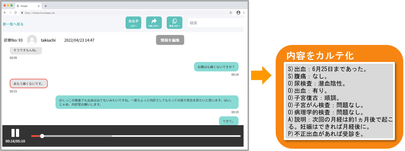 このような課題を踏まえて開発したkanaVoは、医師と患者の声を分離して音声認識するとともに、それをAIが自動でカルテ形式に要約します。このため、医師は全文を読み返す必要はありません。