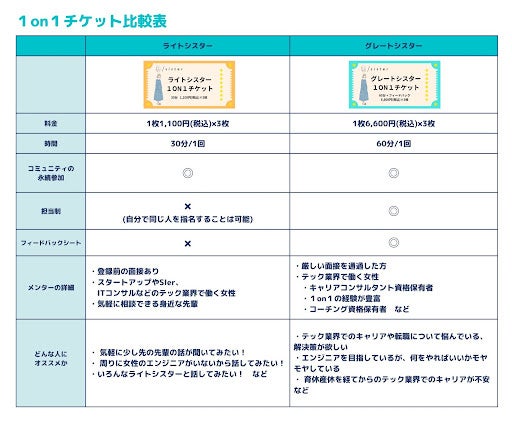 気軽にsisterのサービスを体験していただきたく、8月31日(水)までの期間中、リリース記念キャンペーンとして、ライトシスターとのチケットを550円(税込、3枚ずつ購入可能)で提供します。エンジニアを目指している方も、現在エンジニアとして働いている方もこの期間を機にsisterでの1on1を始めてみてはいかがでしょうか。