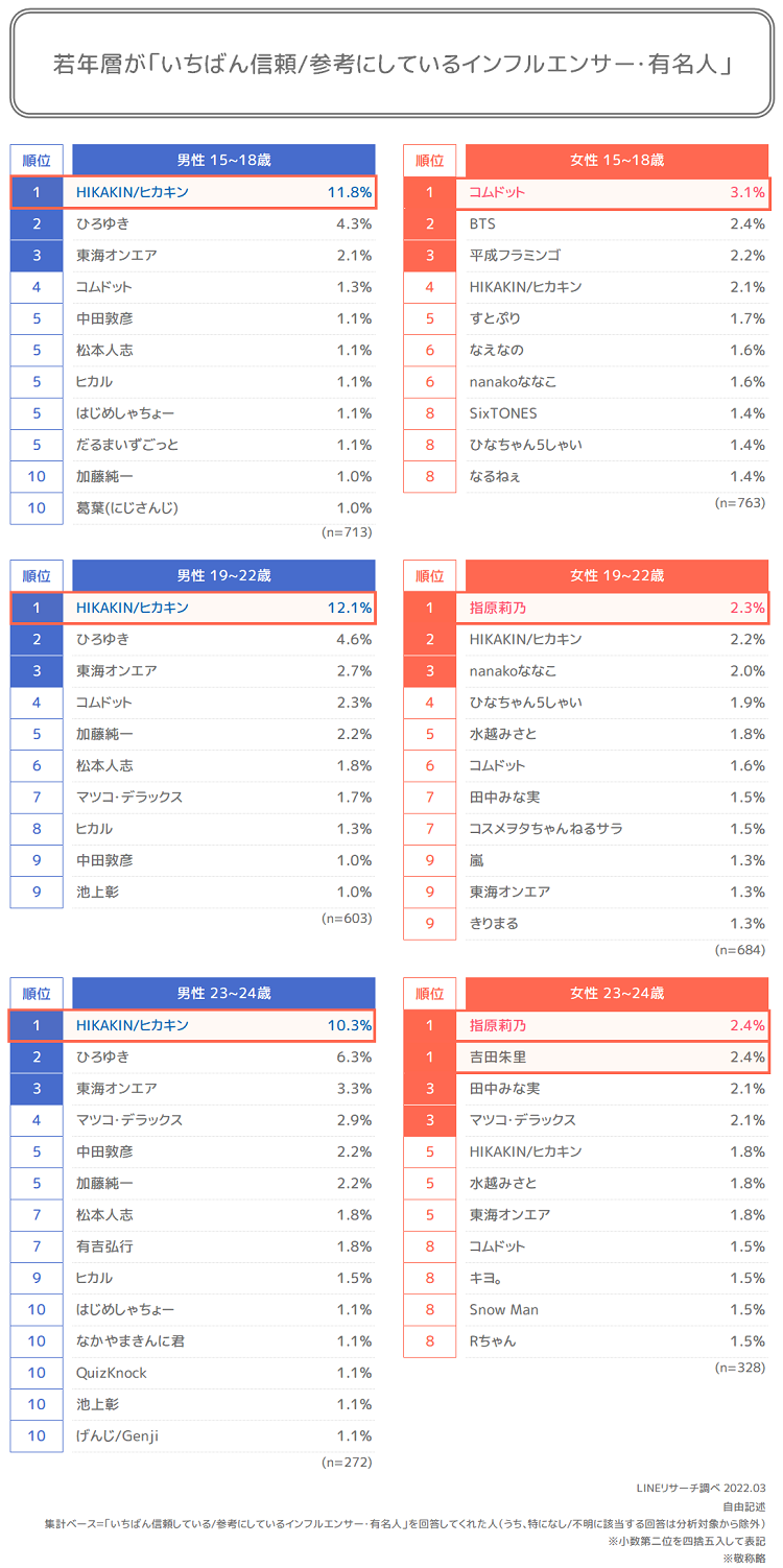 このたびLINEリサーチでは、日本全国の15歳~24歳の男女を対象に、いちばん信頼している/参考にしているインフルエンサー・有名人などについて調査しましたので、その結果をお知らせいたします。