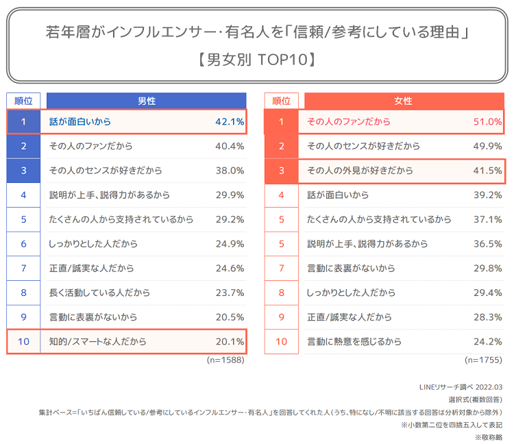 男性の信頼/参考にしている理由は、「話が面白いから」が1位となり、10位に「知的/スマートな人だから」もランクインしています。