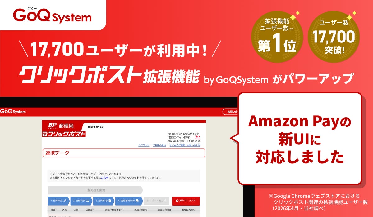 クラウド型受注管理システム「GoQSystem」を運営する株式会社GoQSystem(本社:東京都中央区、代表取締役:藤本 卓治)は、提供中の完全無料ツール「クリックポスト拡張機能 by GoQSystem」において、Amazon Payの新UI(ユーザーインターフェース)への対応を完了したことをお知らせいたします。