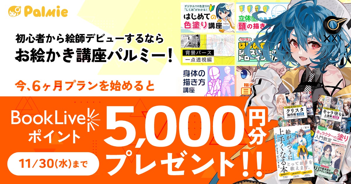 パルミーは、自宅に居ながらイラストやマンガの描き方が学べるオンライン教室です。著名クリエイターや漫画家、アニメーター、専門学校講師など、多くの「プロ」が講師を務めています。月額定額制(サブスク)で授業が受けられる「月謝制」は、累計利用者数15,000名を突破し、順調に利用者数を増やしています。