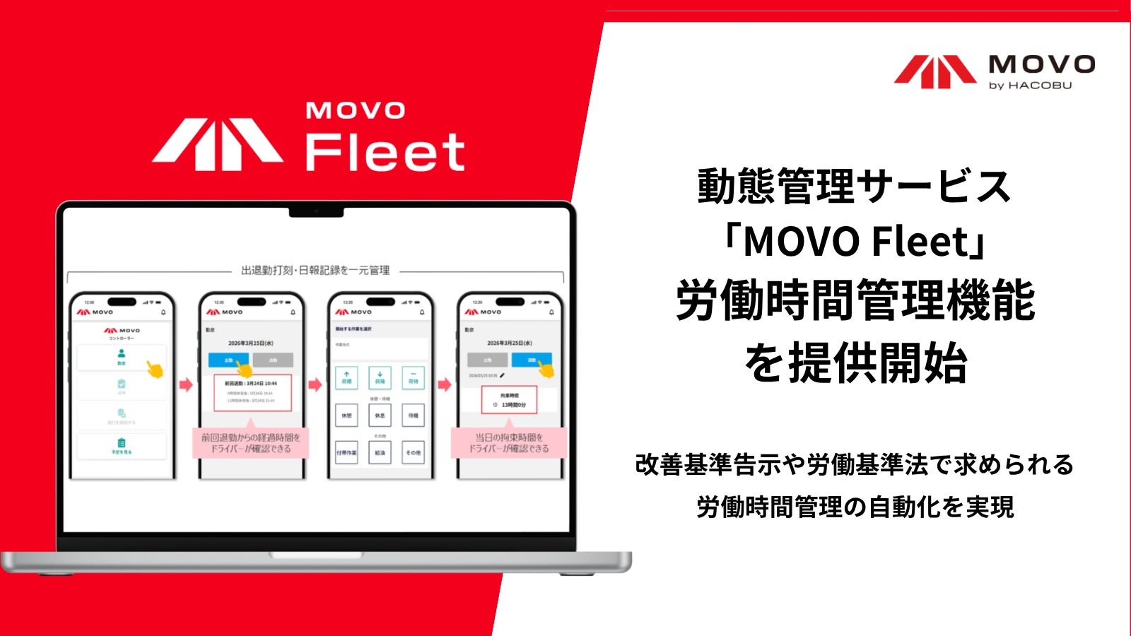 データの力で物流課題を解決する株式会社Hacobuは、動態管理サービス「MOVO Fleet(ムーボ・フリート)」において、「労働時間管理機能」を提供開始いたしました。MOVO Fleetの日報作成機能に、今回提供を開始した出退勤打刻機能を組み合わせることで、トラックドライバーの労働時間を集計するために必要な情報を、MOVO Fleet上でまとめて管理できるようになります。これにより、改善基準告示や労働基準法で求められる労働時間管理を自動化しやすくなります。さらに、複数のシステムやツールに情報を転記する手間が減り、適切な労働時間管理ができないといった課題の解決につながります。