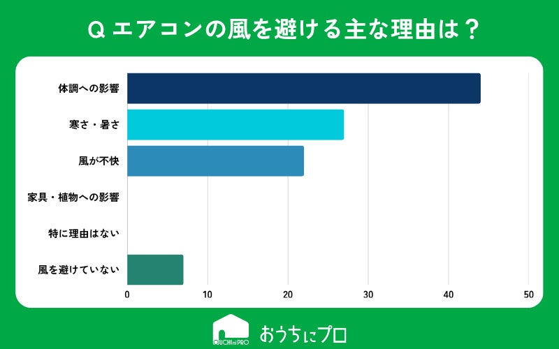 エアコンの風を避ける理由には「体調への影響」「寒さ・暑さ」「風が不快」が挙げられた。