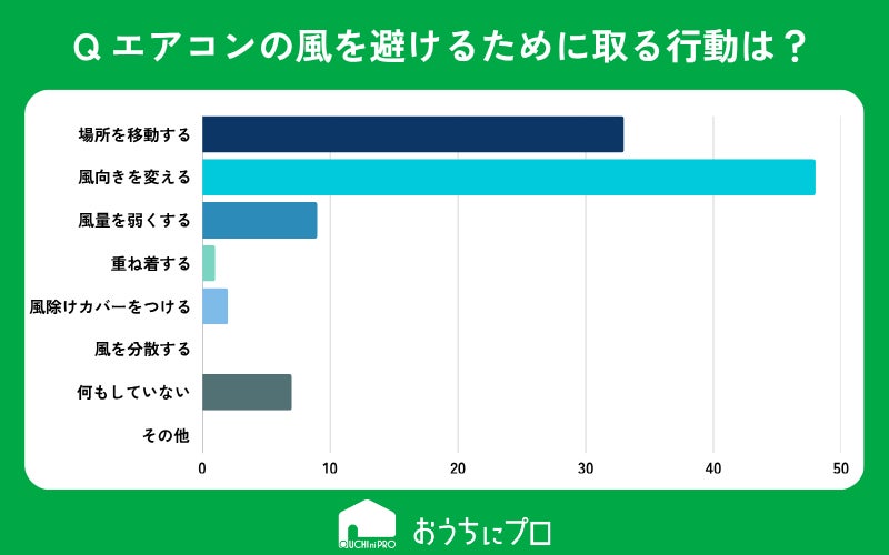 エアコンの風を避ける行動で最も多かったのは「エアコンの風向きを変える」「風が当たらない場所に移動する」。
