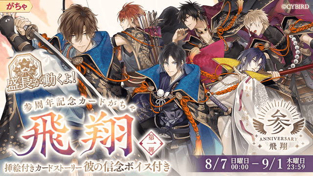 3周年を記念して描き下ろしたイラストを使用し、彼の信念ボイスも付いたカードがちゃ「飛翔 第一弾」を開催しています。
