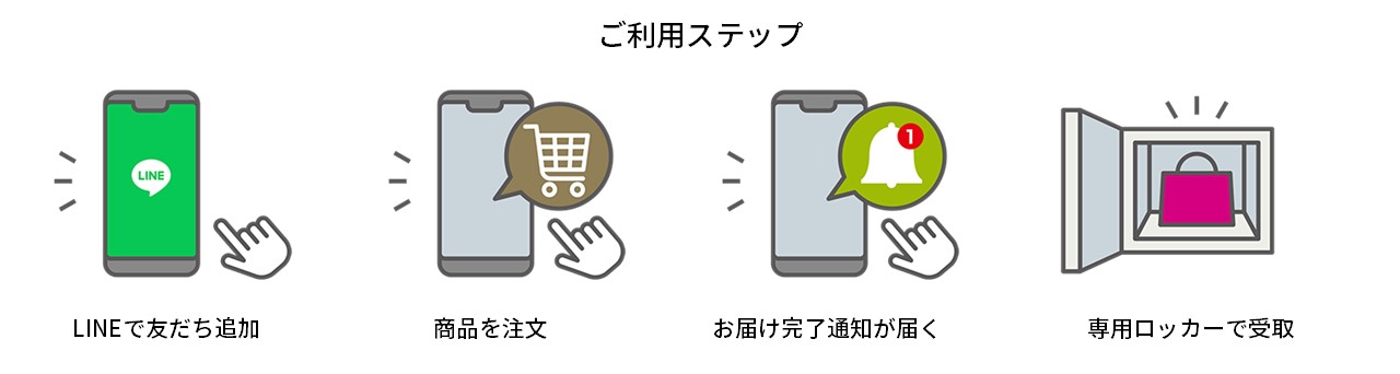 - 配達員には専用アプリを提供し、各店舗を回り商品をピックアップし、商品を各指定駅の専用ロッカーまで運ぶ業務支援を行います。提供の準備が整ったら、お客様にLINEのプッシュ通知でお知らせします。