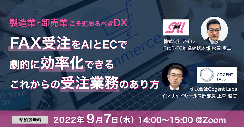 本セミナーでは、特にFAXが残る”受注業務”に焦点をあて、製造業・卸売業でも取り組める「BtoB EC」「AI(人工知能)」を活用したデジタル化の手法と効果、具体的な成功事例をご紹介します。
