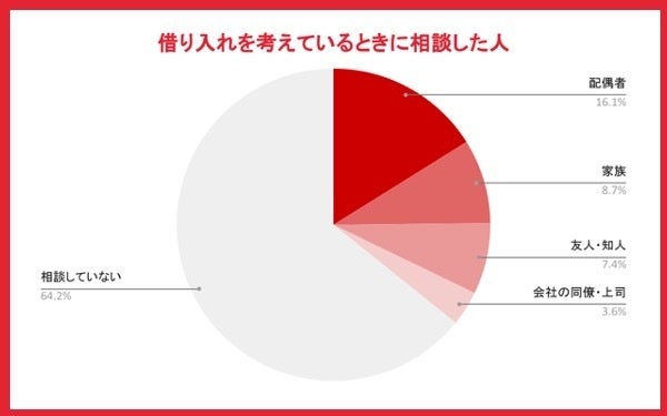 相談していない方は64.2%で、半数以上が誰にも相談せず借入を行なっているようです。相談相手で一番多かったのは「配偶者」で16.1%でした。
