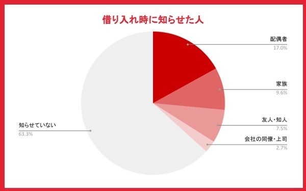 誰にも知らせていない方は63.3%で、半数以上が誰にも誰にも知らせず借入を行なっているようです。知らせた人で一番多かったのは「配偶者」で17.0%でした。