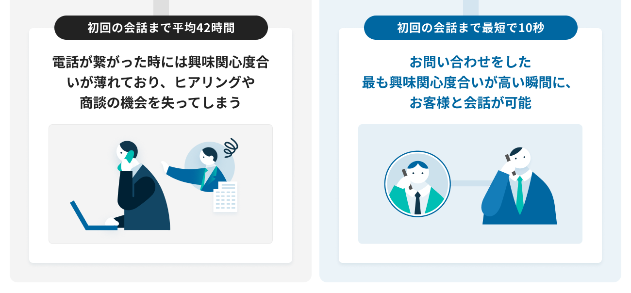電話が繋がった時には興味関心度合いが薄れており、ヒアリングや商談の機会を失ってしまう(初回の会話まで場合によっては約42時間(※1)の時間を要する)