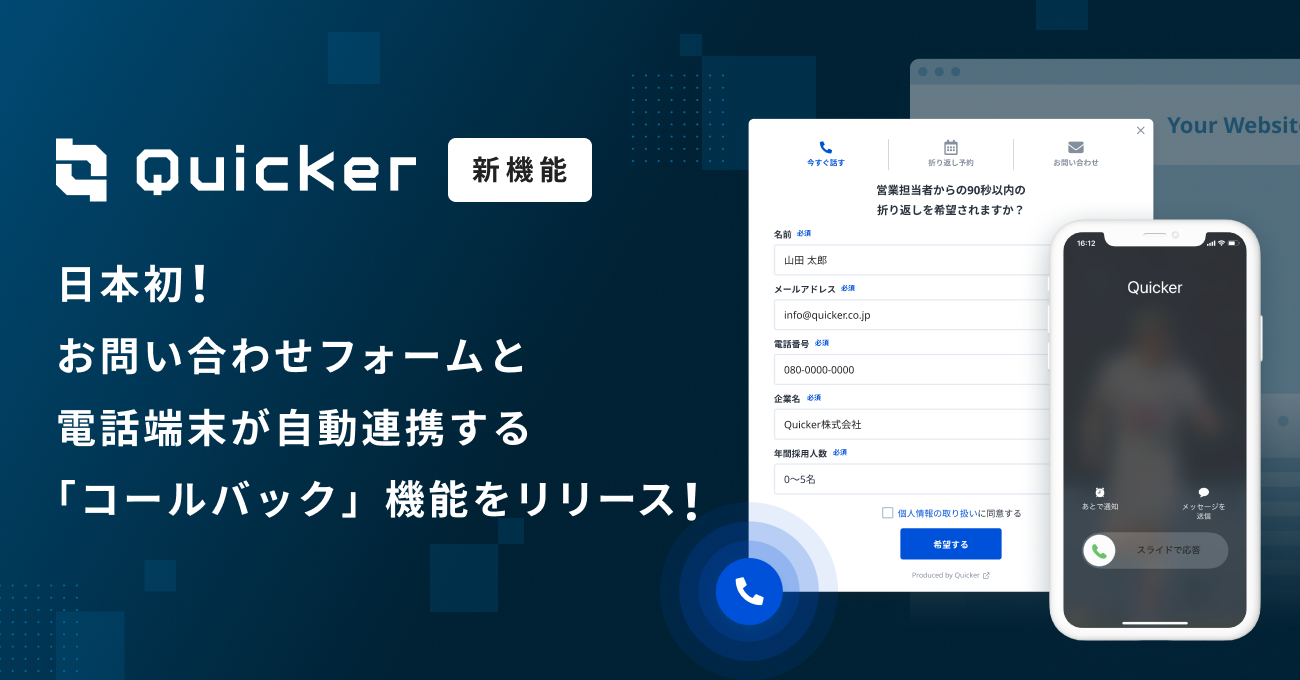 「お問い合わせを頂いたお客様をWebサイトから離脱させることなく、営業担当者の携帯電話端末やIP電話とQuickerが自動連携し、お客様の電話番号に即座に発信を行うことが可能」になります。
