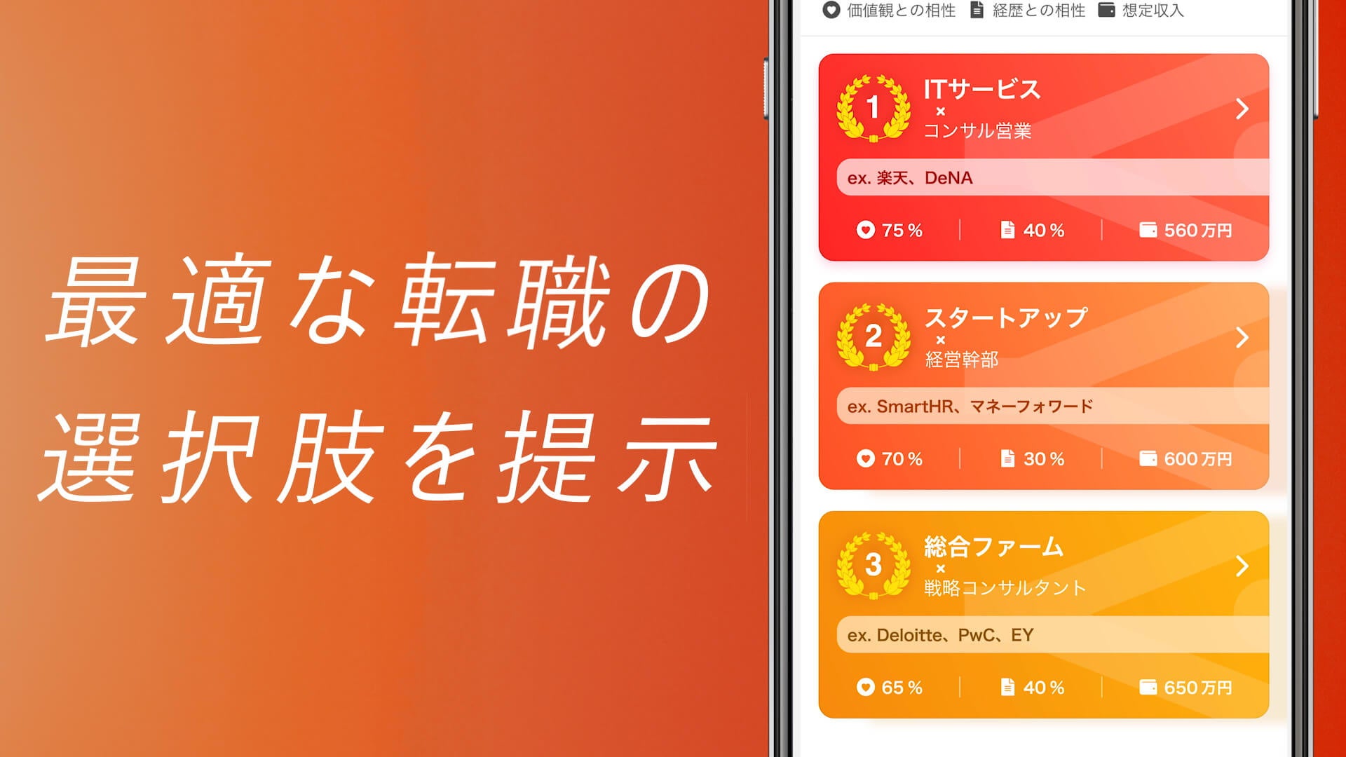 ダイレクトスカウト機能や、経歴と価値観から導き出されるキャリアシナリオの提示、コラムやセミナー配信などパーソナライズされたキャリア情報に簡単にアクセスできる転職サイトです。