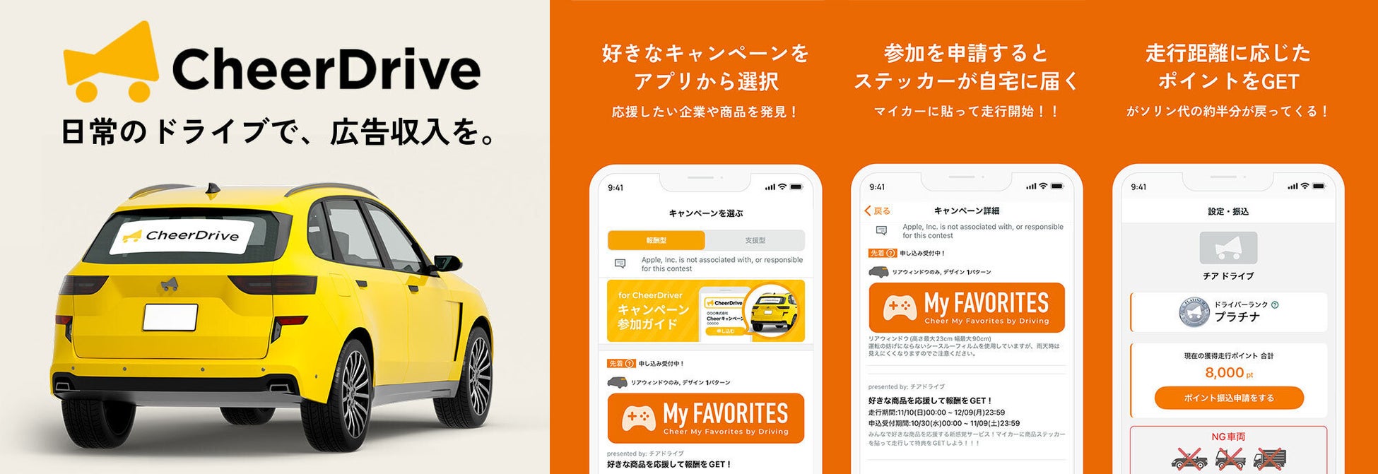 参加者は、⾃家⽤⾞のリアウィンドウにキャンペーンステッカー(上図デザイン)を貼ってドライブするだけで、1kmあたり3円〜5円相当の⾛⾏ポイントを獲得でき、最⼤で5,000pt(5,000円相当)の報酬を得ることができます。