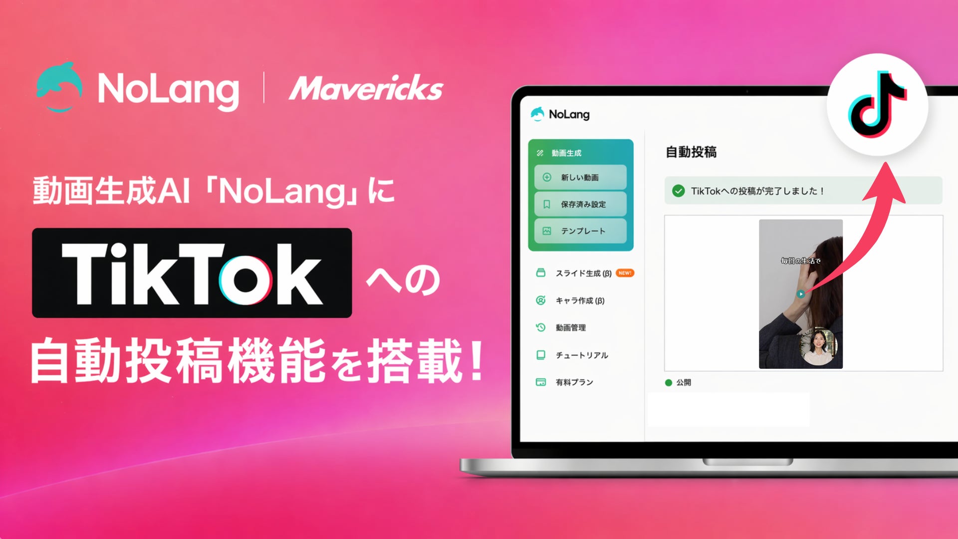 日本発・国内最大級(※)の動画生成AIサービス「NoLang(ノーラン)」を提供する株式会社Mavericks(本社:東京都文京区、代表取締役社長:奥野 将太)は、NoLangで生成した動画をTikTokへ直接投稿できる「TikTok連携機能」の提供を開始しました。本機能により、AIによる動画の自動生成からTikTokへの投稿・公開設定までを、NoLang上でシームレスに完結させることが可能になります。また、商用コンテンツ開示ラベルの自動付与にも対応しており、TikTokのコンプライアンスに準拠した企業アカウントの運用も安心して行えます。動画制作の専門スキルや外注費用をかけることなく、TikTokを活用した情報発信やマーケティングに取り組める環境を実現し、企業の制作コストと運用工数を大幅に削減します。