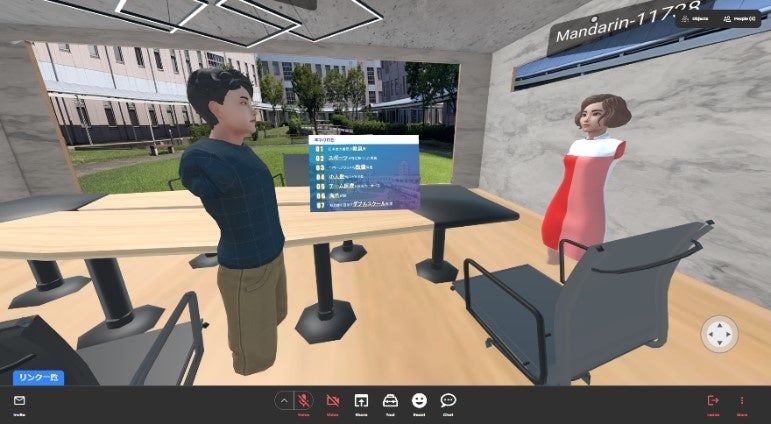 この8月より新たに実施した「メタバース型オープンキャンパス」では、メタバース空間を利用して、全国各地の高校生と本学の在学生・教員が気軽にコミュニケーションをとれる場を作り、高校生の疑問や質問に応えることが可能です。メタバース空間は、自分のアバターを自由に動かし、他のアバターに近づけることで簡単に会話することができたり、テキストでチャットすることが可能です。音声会話をする場合は、自分のアバターに近い声は大きく、遠い声は小さく聞こえ、まるで現実の空間で会話をしているような感覚が味わえます。