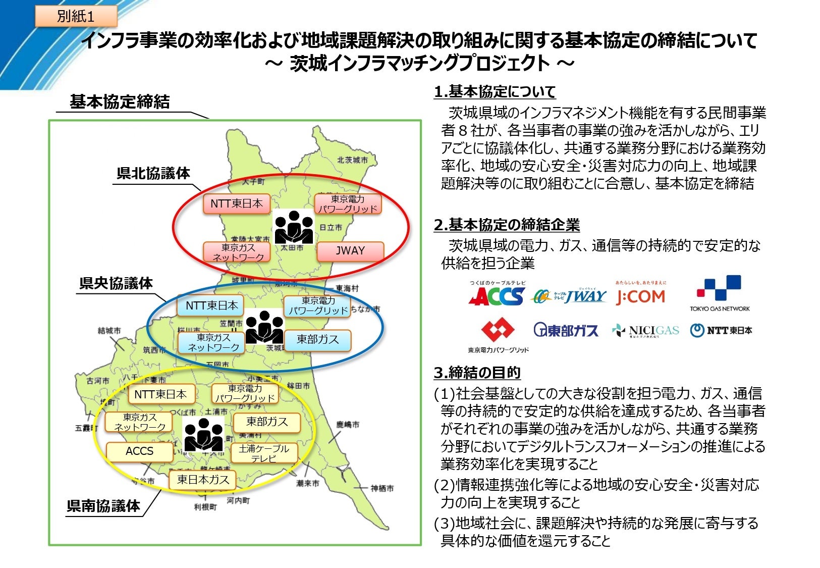 茨城県内のインフラマネジメント機能を有する民間事業者8社 ※1 は、各社が担う電力、ガスおよび通信等のそれぞれの事業の強みを活かしながら、エリアごとに協議体化※2して、相互の業務効率化、災害対応力の向上、地域課題解決の推進に取り組むことに合意し、基本協定を結ぶことになりましたので、締結式を開催します。