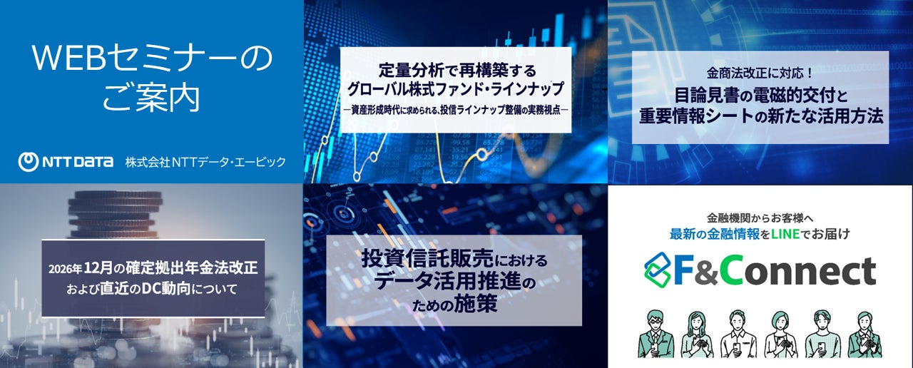 株式会社NTTデータ・エービック(本社:東京都港区、代表取締役社長 大谷 温仁、以下「当社」)、金融機関様の投資信託販売を支援する当社サービスに関するWEBセミナーを随時開催しています。5月は、5つのWEBセミナーを開催します。