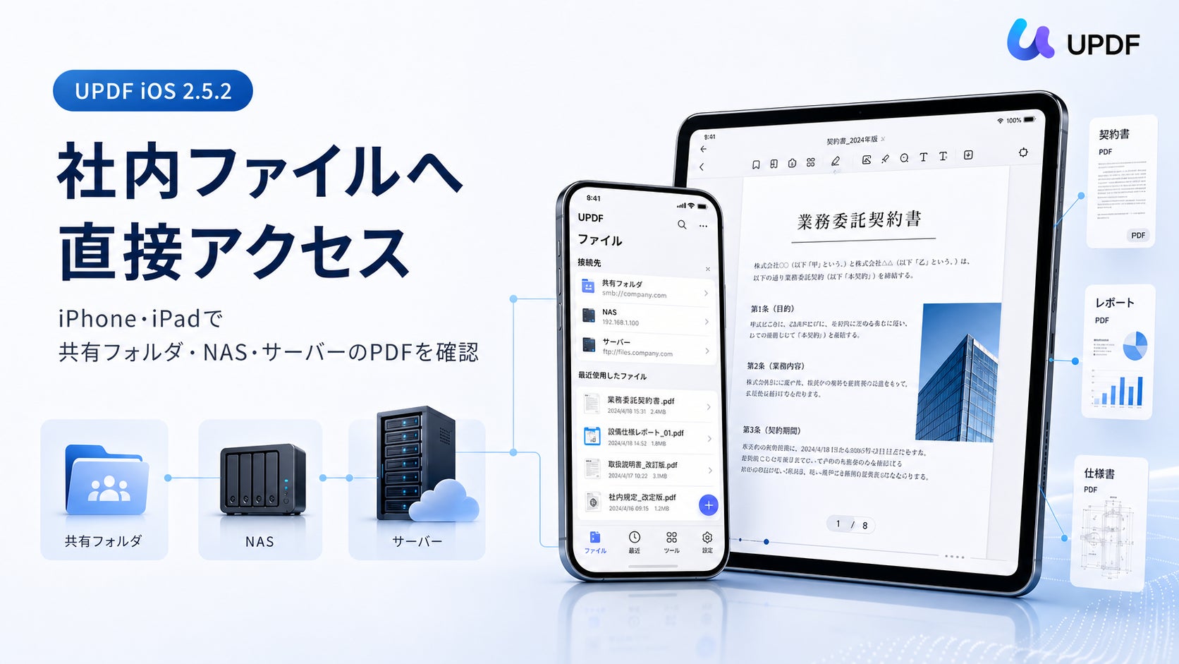 企業や専門チームでは、契約書、見積書、報告書、設計資料、仕様書などの重要な文書が、クラウドストレージだけでなく、社内共有ドライブ、NAS、ファイルサーバーなどに保存されているケースも少なくありません。UPDF for iOSは今回の対応により、こうした実際の業務環境により適したモバイルPDFワークフローを提供します。