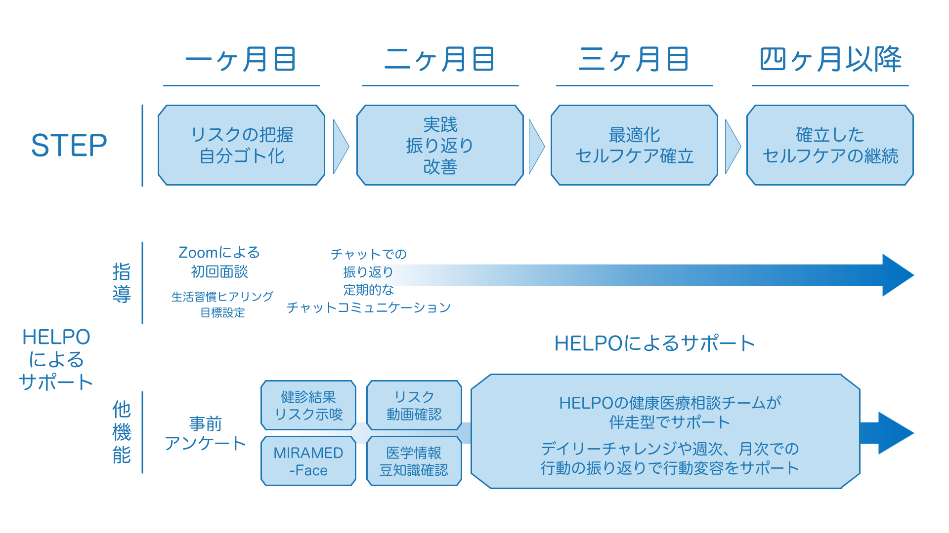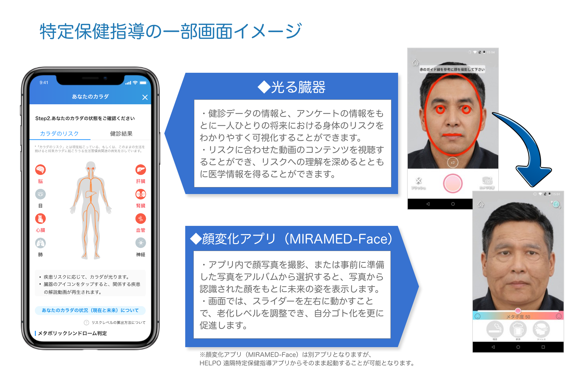 ※「HELPO 遠隔特定保健指導」は、東京大学センター・オブ・イノベーション「自分で守る健康社会拠点」が開発したメタボリックシンドロームや関連疾患のリスクを減らすための行動変容アプリケーション「MIRAMED」をベースに開発したものです。