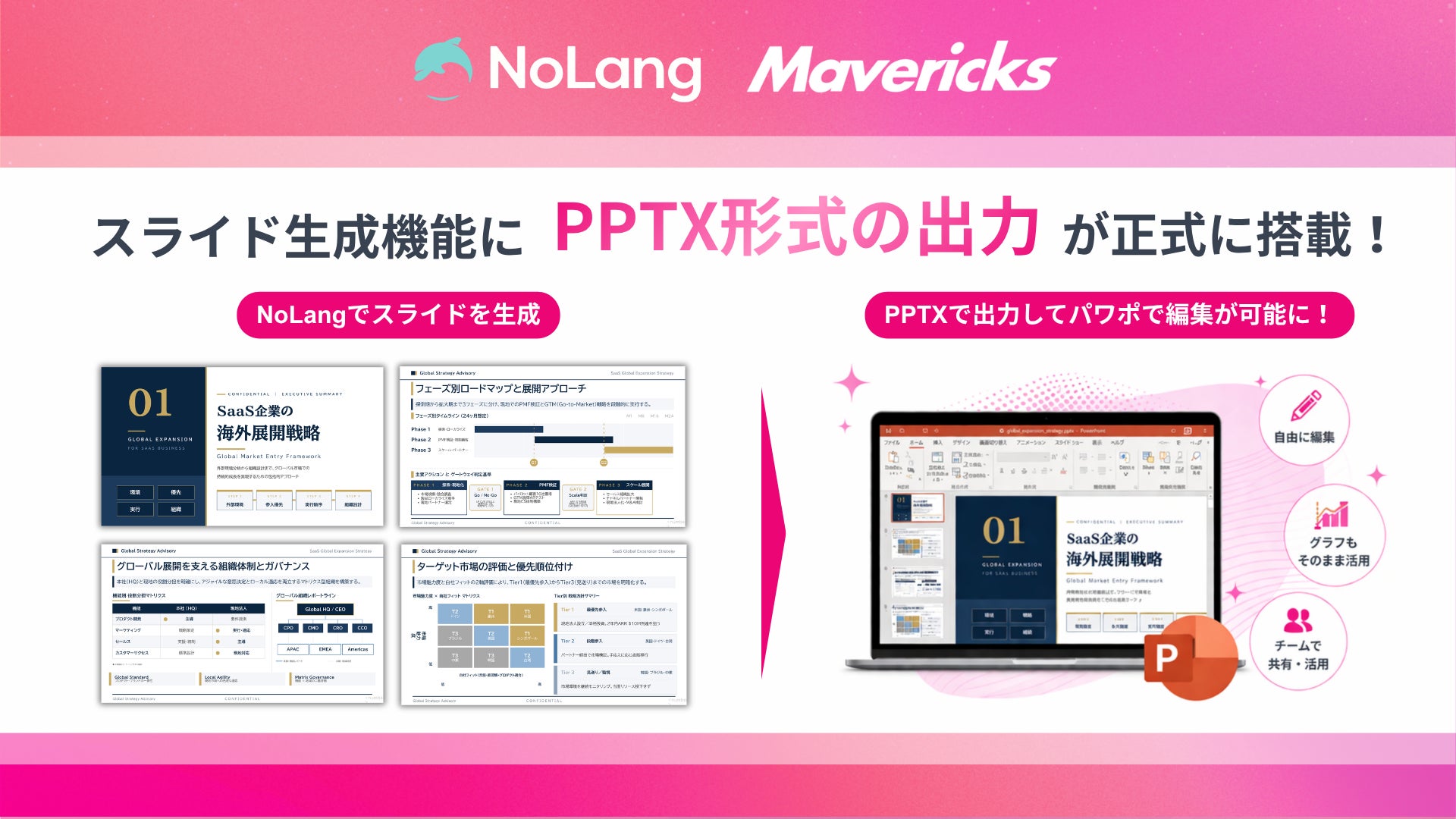 日本発、動画生成AI「NoLang(ノーラン)」を提供する株式会社Mavericks(本社:東京都文京区、代表者:代表取締役社長 奥野 将太)は、本日、法人プランのスライド生成機能に正式にPPTX形式エクスポート機能を搭載し、PowerPoint・Google Slidesで直接編集できる形式へ対応しました。これにより、NoLangで生成したスライドをPowerPoint・Google Slidesで自由に編集できるようになり、AIによる自動生成と手作業による細部仕上げを組み合わせたハイブリッドな資料制作ワークフローが実現します。
