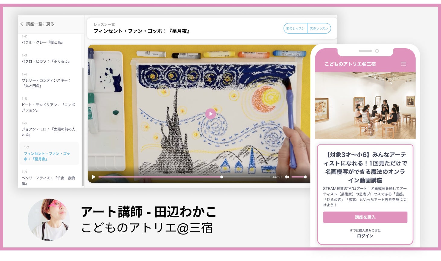 都内でこども向けのアトリエを開講されている田辺わかこさんの動画講座。実際に手を動かしながら学べるよう丁寧に解説されており、様々な名画の模写を通してアート思考を身につけることができます。