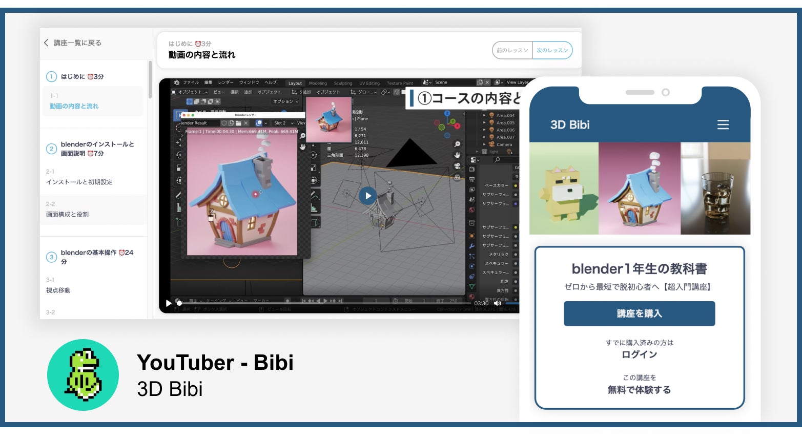 YouTubeにて、3DCGソフト「Blender」の解説動画を投稿しているBibiさんの動画講座。合計8時間以上の体系的な学習内容を通して、Blenderが初めての方でも最短で脱初心者を目指すことができます。