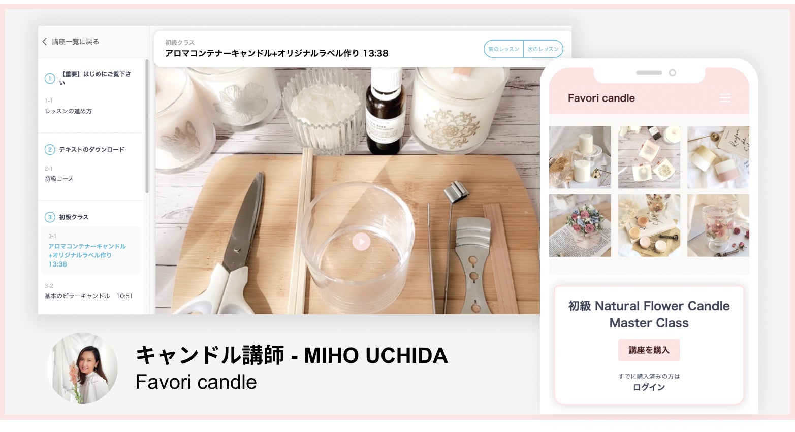 キャンドル歴8年のMIHO UCHIDAさんが提供する「キャンドル作り」の動画講座。動画に加え、特典の専用テキストを繰り返し見ながら、キャンドル制作の基礎から応用まで学ぶことができます。