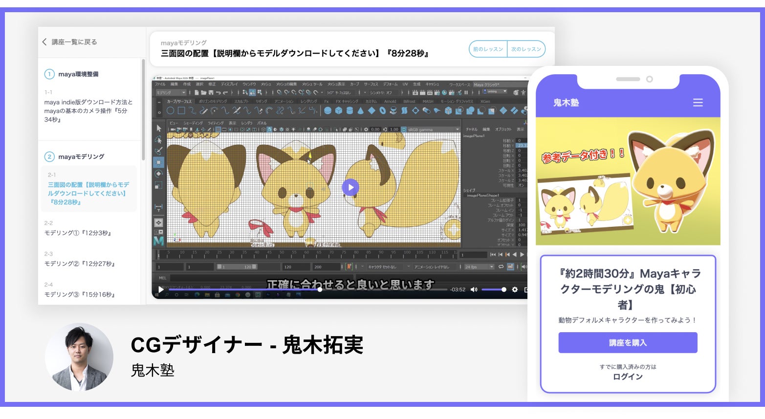 フリーランスのCGデザイナーとして活躍する鬼木拓実さんの動画講座。3DCGソフト「Maya」を使ったキャラクターモデリングの基礎を習得でき、悩んだ時はTwitterでプロのアドバイスを受けることもできます。