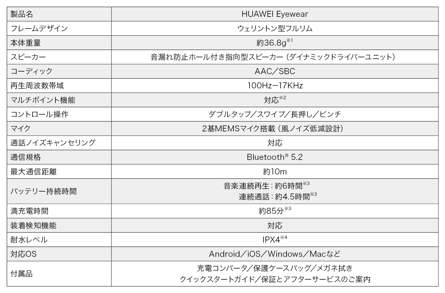『HUAWEI Eyewear』 (ウェリントン型フルリムモデル)の主な仕様