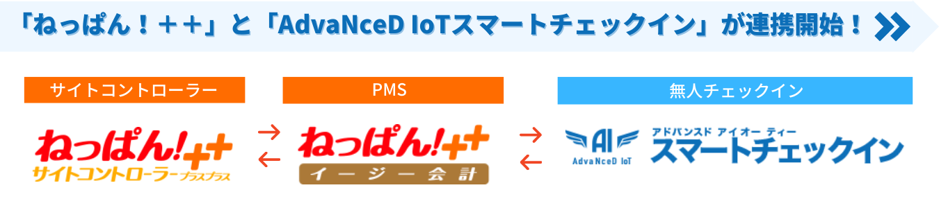 今回のAPI連携により「AdvaNceD IoTスマートチェックイン」の管理システムが「ねっぱん!サイトコントローラー++」および「ねっぱん!イージー会計」の管理する予約情報、顧客情報、部屋割り等の情報を自動で取得することができるようになります。
