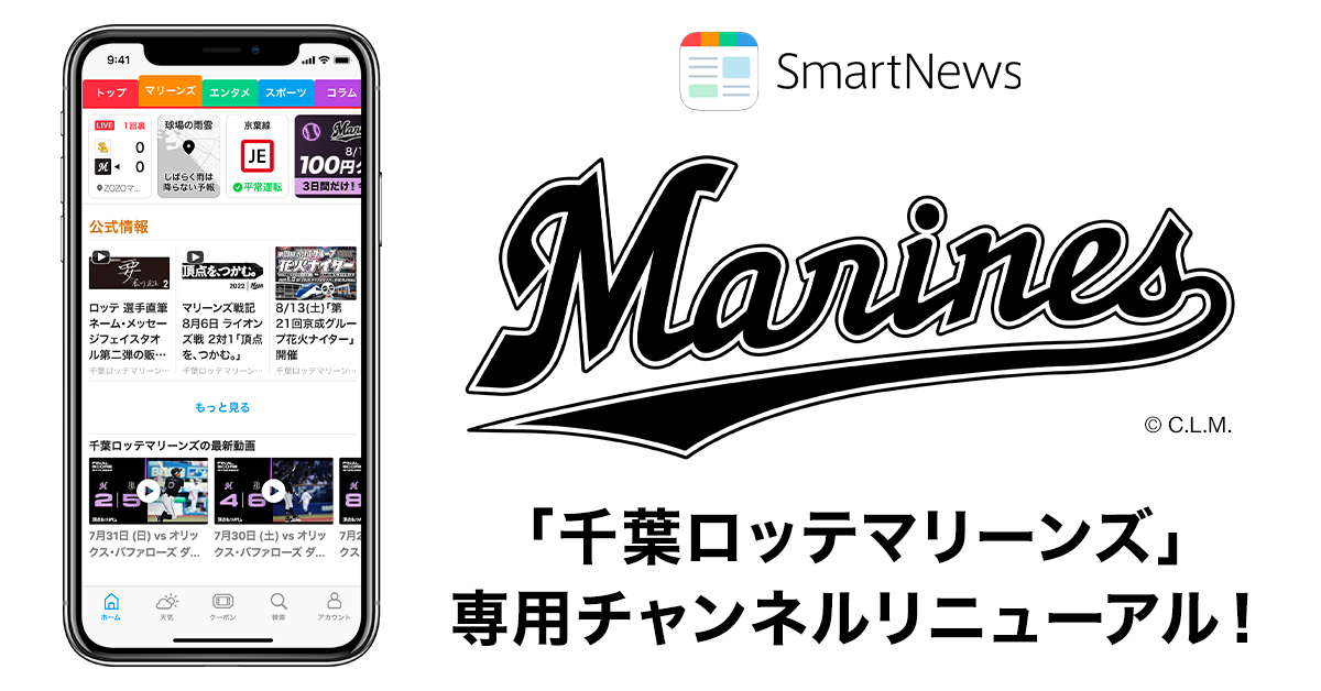 チャンネルリニューアルの特別企画として、8月13日(土)に、ZOZOマリンスタジアム(千葉市)で開催される「BLACK SUMMER WEEKEND」で、SmartNewsの特別ブースを設置します。特別ブースでは、SmartNewsアプリで「千葉ロッテマリーンズチャンネル」を追加いただいた方へ、もれなくロッテのお菓子をプレゼントします。また選手直筆サイン入りボールなどが当たる抽選会を実施します。さらに8月12日(金)から14日(日)に、スタジアムのフードをお得にご利用いただけるクーポンの抽選を、「千葉ロッテマリーンズチャンネル」で実施します。