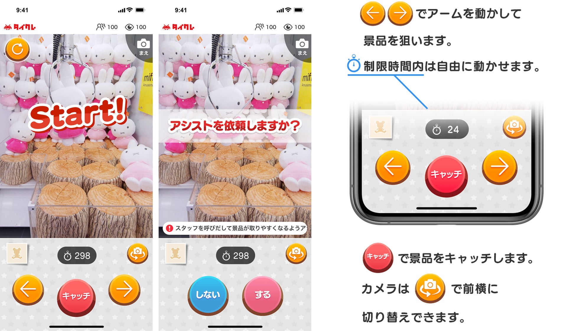 「タイトーオンラインクレーン(タイクレ)」は、いつでもどこからでもPCやスマートフォン、タブレットから本物のクレーンゲームを遠隔でプレイすることができるサービスで、獲得景品は週1回無料でご自宅に配送いたします。景品はぬいぐるみやフィギュアなどアミューズメント施設と変わらぬ品揃えの上、タイクレ限定景品も毎月多数登場。一定回数以上プレイいただいても景品を獲得できない時はスタッフが景品を移動し獲得をお手伝いする「アシストサービス」を実装しており、お客様よりご好評をいただいております。Webブラウザ版をはじめ、iOSアプリ版、Androidアプリ版、Yahoo!ゲーム版、Fire TV版にてお楽しみいただけます。