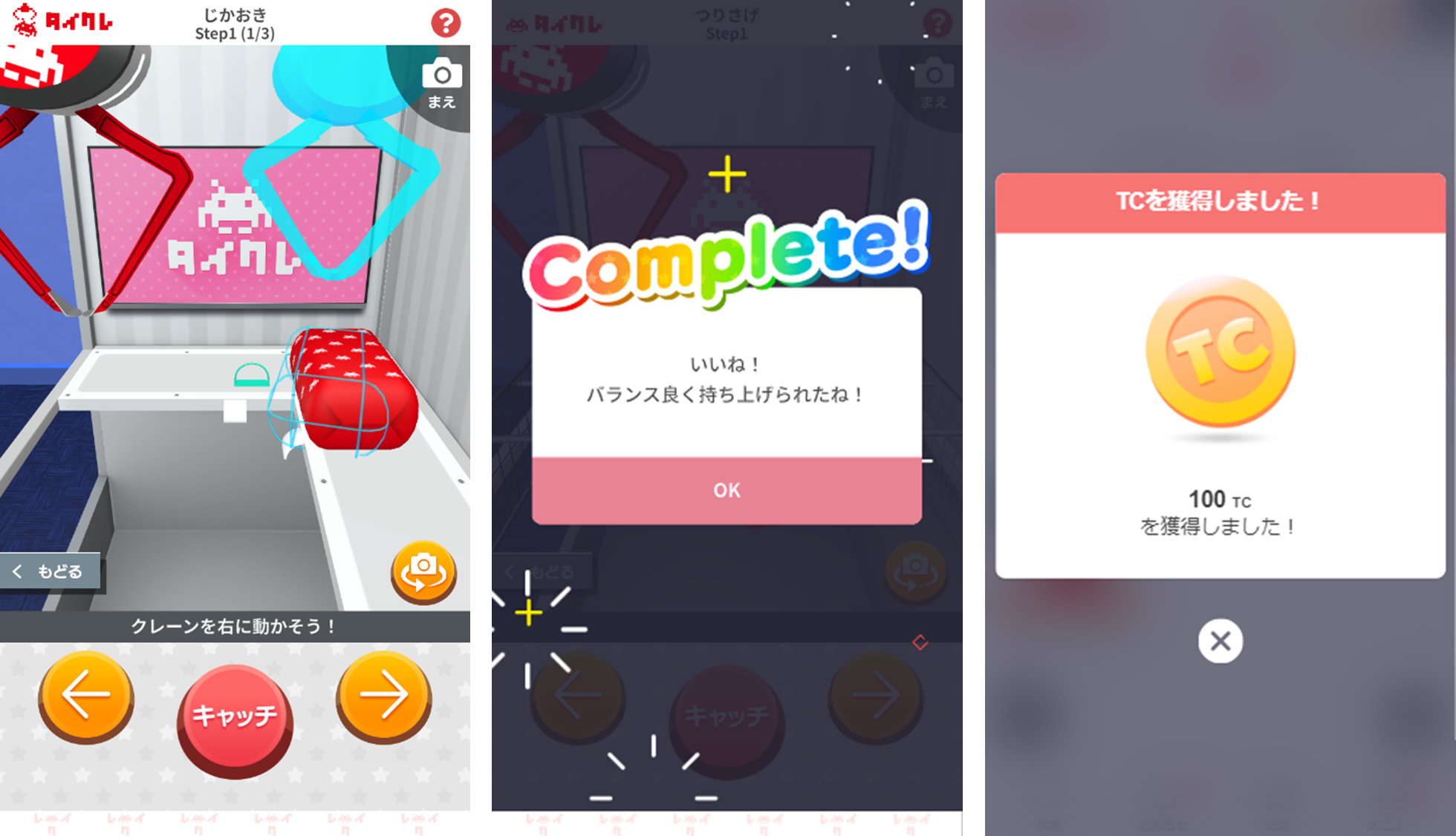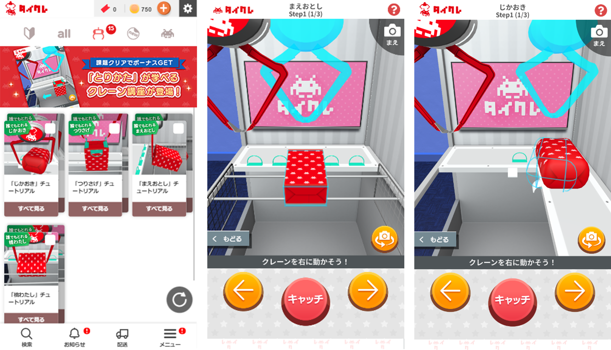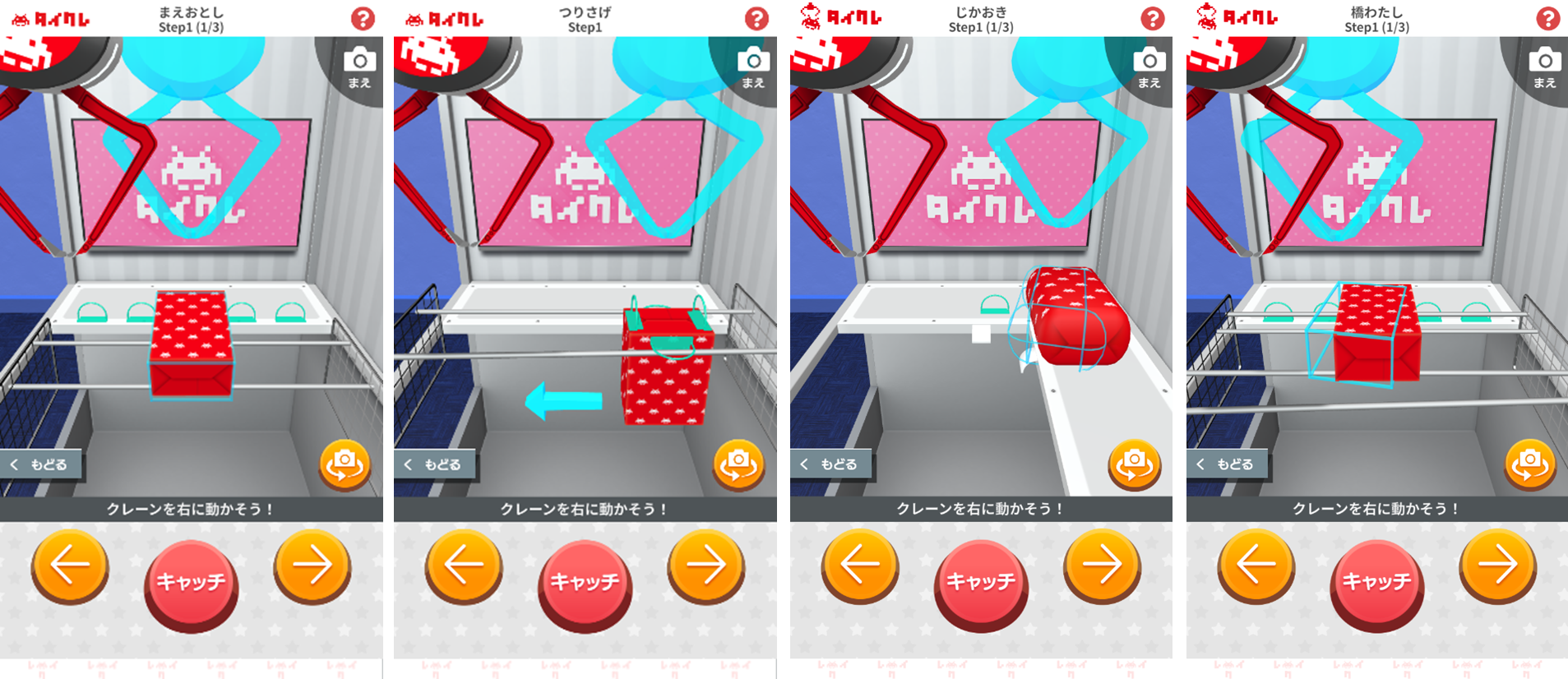 「クレーン講座」は、3Dモデルで再現されたクレーンゲームを使って、景品の取り方をレクチャーしてくれる新コンテンツです。タイクレのユーザー登録をしていただくことで、「クレーン講座」を無料でプレイいただけます。ステップごとに画面に表示されるガイドに従って遊んでいくことで、「じかおき」「つりさげ」「まえおとし」「橋わたし」といった、タイクレ定番の遊び方の攻略法を身につけていただけます。